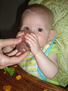 La cuchara puede aparecer en este momento también. Comienza con una pequeña. Dale a tu hijo la comida de a poco y en pocas cantidades. Cuando veas su respuesta, si se adapta bien, puedes aumentar las porciones.
