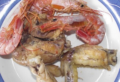 En una cazuela ponemos el ajo picadito con un chorrito de aceite y lo sofreimos un poco durante 3 o 4 minutos. Cuando está empezando a dorarse echamos las gambas previamente salpimentadas y lo dejamos durante otros 3 minutos. Sacamos en un plato y reservamos.