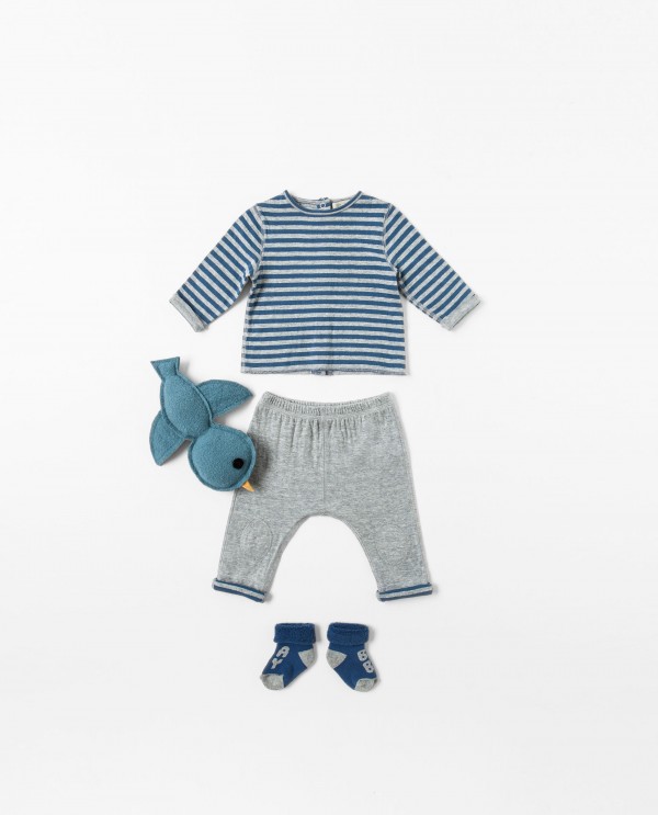 - Conjuntos a rayas como el que veis en este otro “look” os permitirá que vuestros peques estén cómodos tanto en casa, como para salir de paseo.