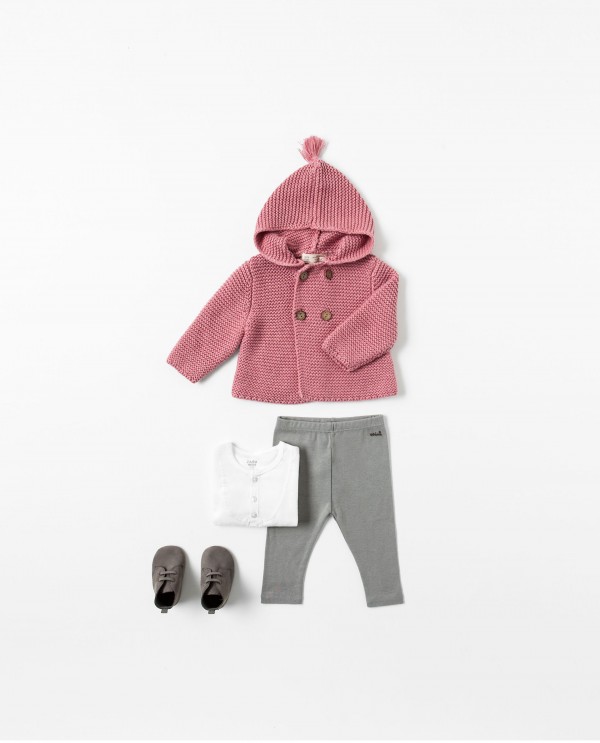 - Y si quieres que tu pequeña vaya abrigada y además ideal ¿qué te parece este abriguito de punto y botones y en rosa? Con, camiseta de botones, leggings a juego,y botitas de piel.