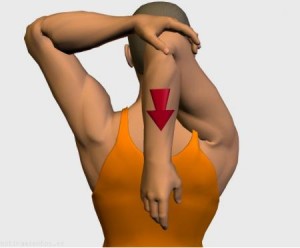 Ponte de pie o sentado, con tus brazos en la cabeza, sostiene un codo con la mano del otro brazo. Lentamente tira e codo hacia tu nuca.