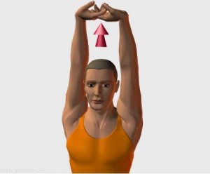 De pie o sentados, entrelazamos las manos y estiramos los brazos hacia arriba, como si quisieramos tocar el techo.
