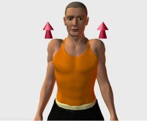 De pie o sentados, con los brazos estirados pegados al cuerpo, levantamos los hombros.