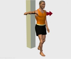 Ponte de pie, con el brazo extendido en posicion horizontal, con el cuerpo girado, agárrate a una columna y gira el torso para estirar.