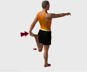 Con el cuerpo totalmente recto, coge tu pierna y flexionala hacia atrás hasta cogerla con la mano, tira de ella hacia arriba