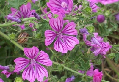 La malva es una planta perenne que pertenece a la familia de las malváceas y puede alcanzar hasta 1,5 metros de altura. Sus tallos son vellosos y leñosos en la base, con hojas muy variables, generalmente lobuladas y de bordes dentados. Sus flores, de 2 a 4 cm de diámetro, son de color rosa o púrpura con venas más oscuras, y sus frutos presentan ángulos prominentes y están cubiertos de vellos.