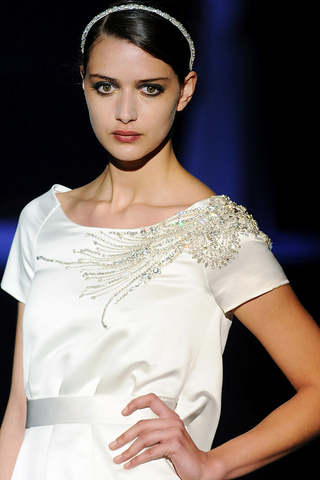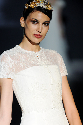 Para que veáis la diferencia entre el maquillaje que os he mostrado antes y el que podemos ver aquí. Pertenece al mismo desfile de Jesús Peiró y en esta ocasión vemos a una modelo con un maquillaje algo más acertado, aunque sigue sin acabar de convencerme para una novia.