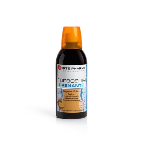 Por un lado está Turboslim Drenante, de Laboratorios Forté Pharma, un complemento alimenticio con sabor a melocotón. Se trata de una bebida que ayuda a eliminar y drenar líquidos y toxinas gracias a una serie de ingredientes naturales en su fórmula: cactinea, rabos de cereza e hibiscus. También lleva ginseng y guayaba para remineralizarte y té verde para quemar calorías. Es muy fácil de usar: diluyes 50 ml de Turboslim en una botella de litro y medio de agua, y ya está listo para beber. Lo puedes meter en la nevera para que esté más fresquito y así obtendrás una bebida muy refrescante.