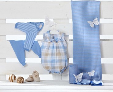 - Otra colección diseñada para los bebés, y que incluye prendas cómo estas que vemos en la imagen de arriba en la que se muestre un “pelele” para niños y un vestido para niña, realizado en una tela fina y suave de algódón, con caladitos, combinada con un forro de muselina en tonos pastel azul y rosa, que da volumen y un toque de color.