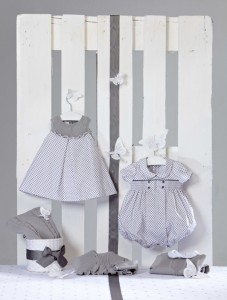 - Prendas en algodón y en tonos que no es que sean muy llamativos, aunque sí muy elegantes. De hecho con las prendas de esta colección, podéis vestir a los bebés y a los niños para acudir a todo tipo de celebraciones. En la imagen de arriba vemos conjuntos en tonos grisáceos, y que se presenta en diversas intensidades tanto para vestidos como para “peleles” que además cuentan con un fruncido especial para darle mayor volúmen.