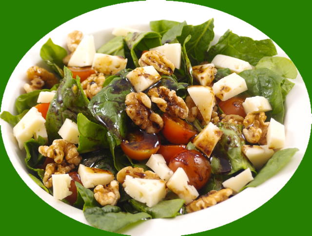 - Para la ensalada, pondremos la espinaca fresca en un plato grande y añadiremos en este plato todos los ingredientes previamente listados y removeremos bien. Usaremos el vinagre y la miel para aliñar al gusto y si lo deseamos, también podemos añadir algo de salsa de yogur.